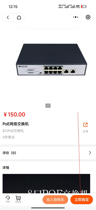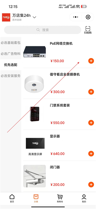 1、打開軟件進入分類頁面,瀏覽必選基礎套餐及優選配件類商品,選擇PoE網絡交換機條目,點擊進入該商品的詳情頁面查看信息。