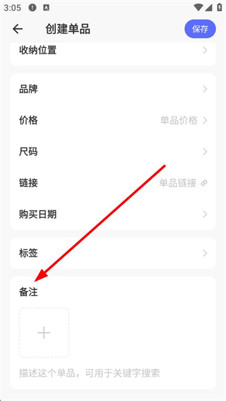 4、創建單品頁面下方,有備注區域,可點擊加號添加描述內容,這些內容可用于后續的關鍵字搜索,完善單品信息。