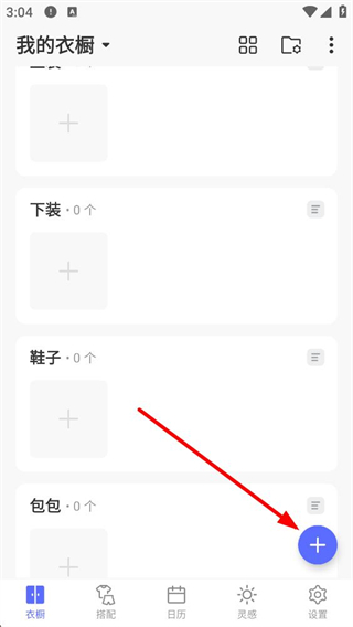 1、進入我的衣櫥界面,可看到上衣、下裝等分類欄,各分類當前數量為0,界面右下角有一個加號按鈕,點擊該按鈕可觸發操作選項。