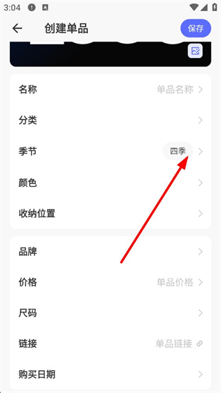 3、進入創建單品頁面,可設置名稱分類季節等信息,季節默認顯示為四季,還能補充顏色收納位置等詳細內容。
