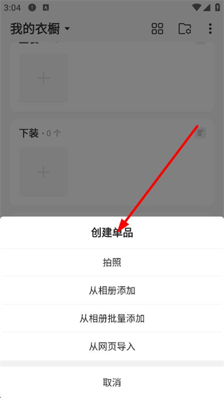 2、點擊加號按鈕后,會彈出包含創建單品拍照從相冊添加等選項的菜單,選擇對應選項即可開始添加衣櫥單品。