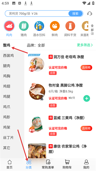 2、點擊分類頁面,可篩選食材,以雞肉為例,展示整雞等品類,標注認證可見價格等信息。