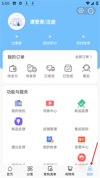 4、我的頁面需登錄注冊,可查看優惠券、積分、賬單,管理訂單狀態,還有錢包、領券中心等功能與服務選項。
