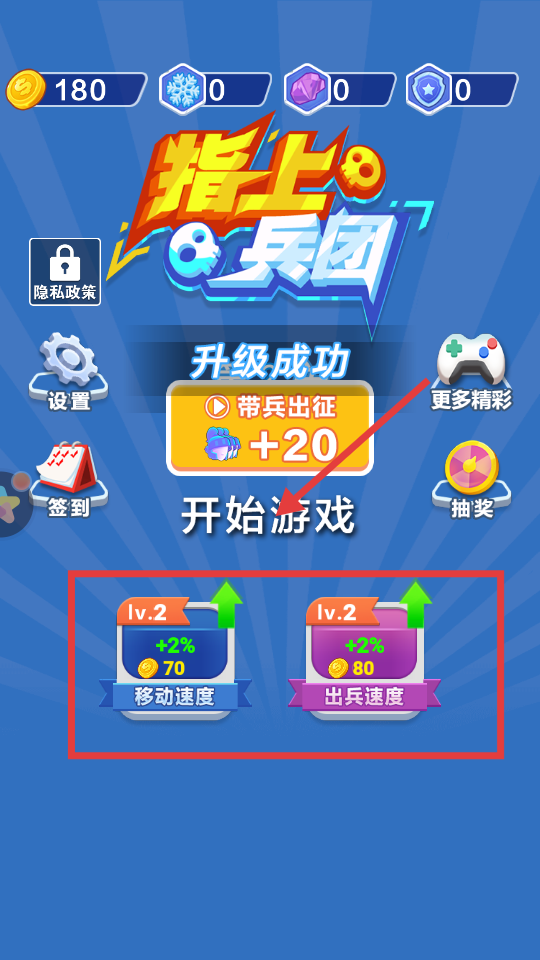 1、進入游戲主界面能看到移動速度、出兵速度等已升級的屬性,可對其升級提升兵團戰力,點擊開始游戲就能進入關卡,開啟兵團征戰之旅。