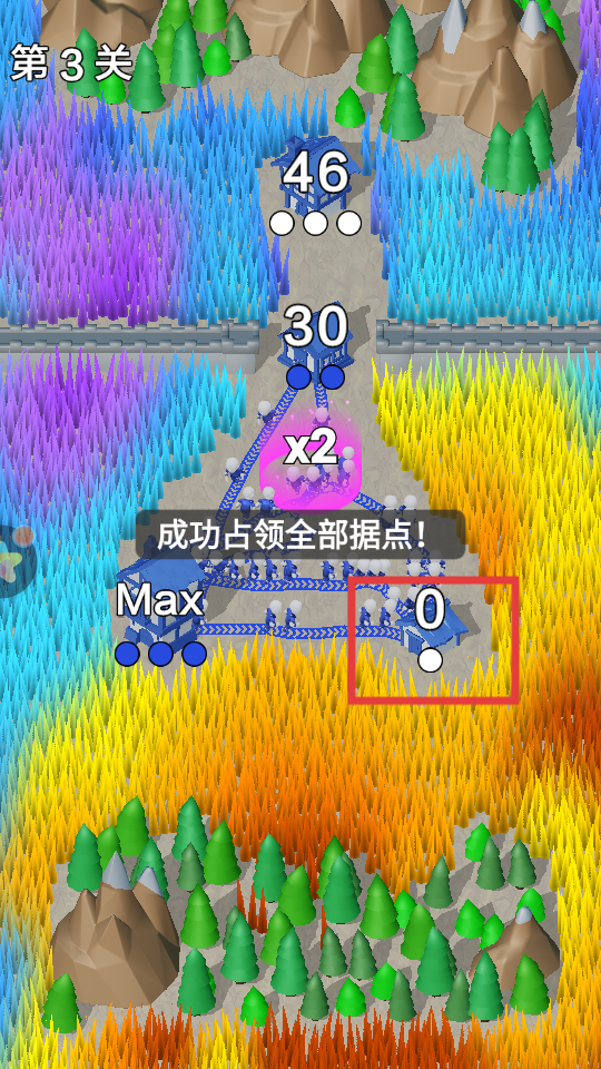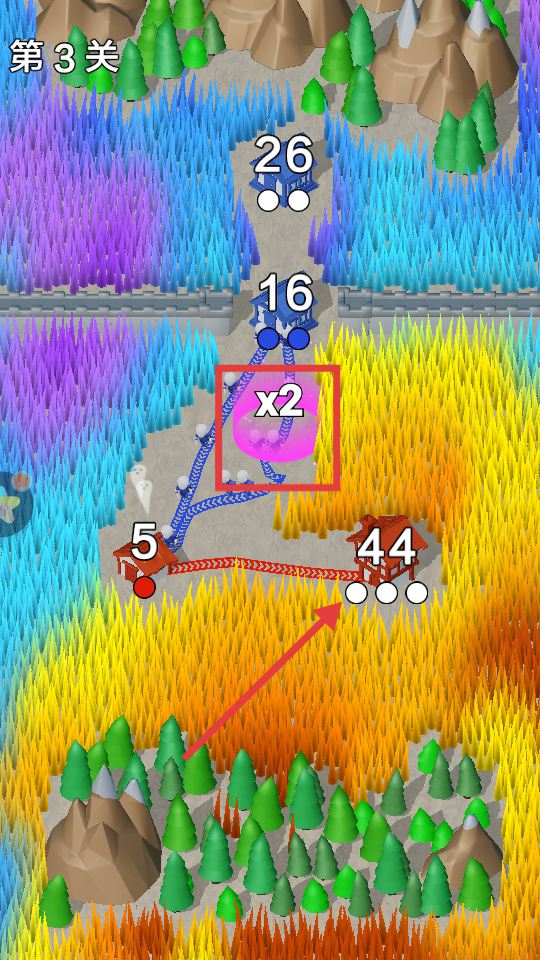 2、關卡中據點上有數字代表兵力,紅框內的x2區域是增益效果區,能讓經過的兵團兵力翻倍,你需要指揮藍色兵團沿著路線移動,向紅色敵方據點推進爭奪據點控制權。