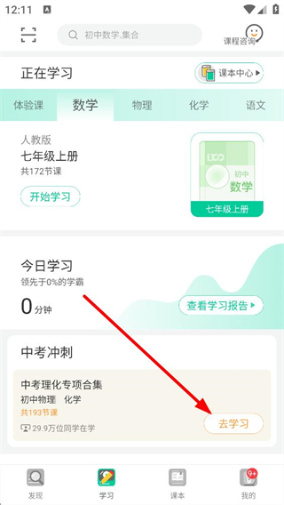 2、點擊學習頁面,支持課程搜索,顯示人教版七年級數學學習進度,含體驗課與中考沖刺課。