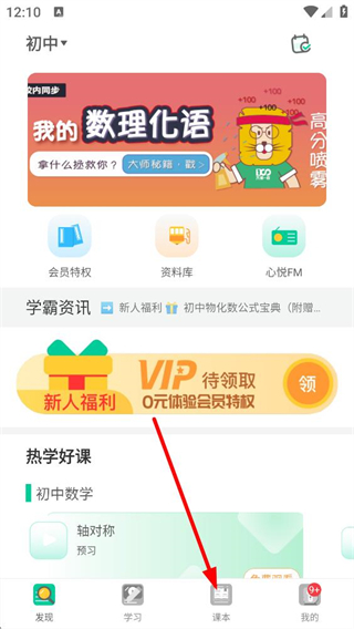 1、點擊發現頁,針對初中學習,聚合會員特權等功能,呈現學霸資訊與課程上新。