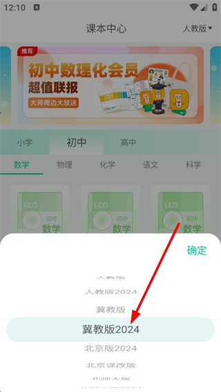 3、課本中心可切換教材版本,選定如冀教版2024等版本后點擊確定,即可匹配對應教材內容,便于跟隨教材同步學習。