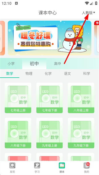3、點擊課本中心頁,展示人教版小初高多學科課本,頂部有暖冬好課促銷活動,方便選課本。