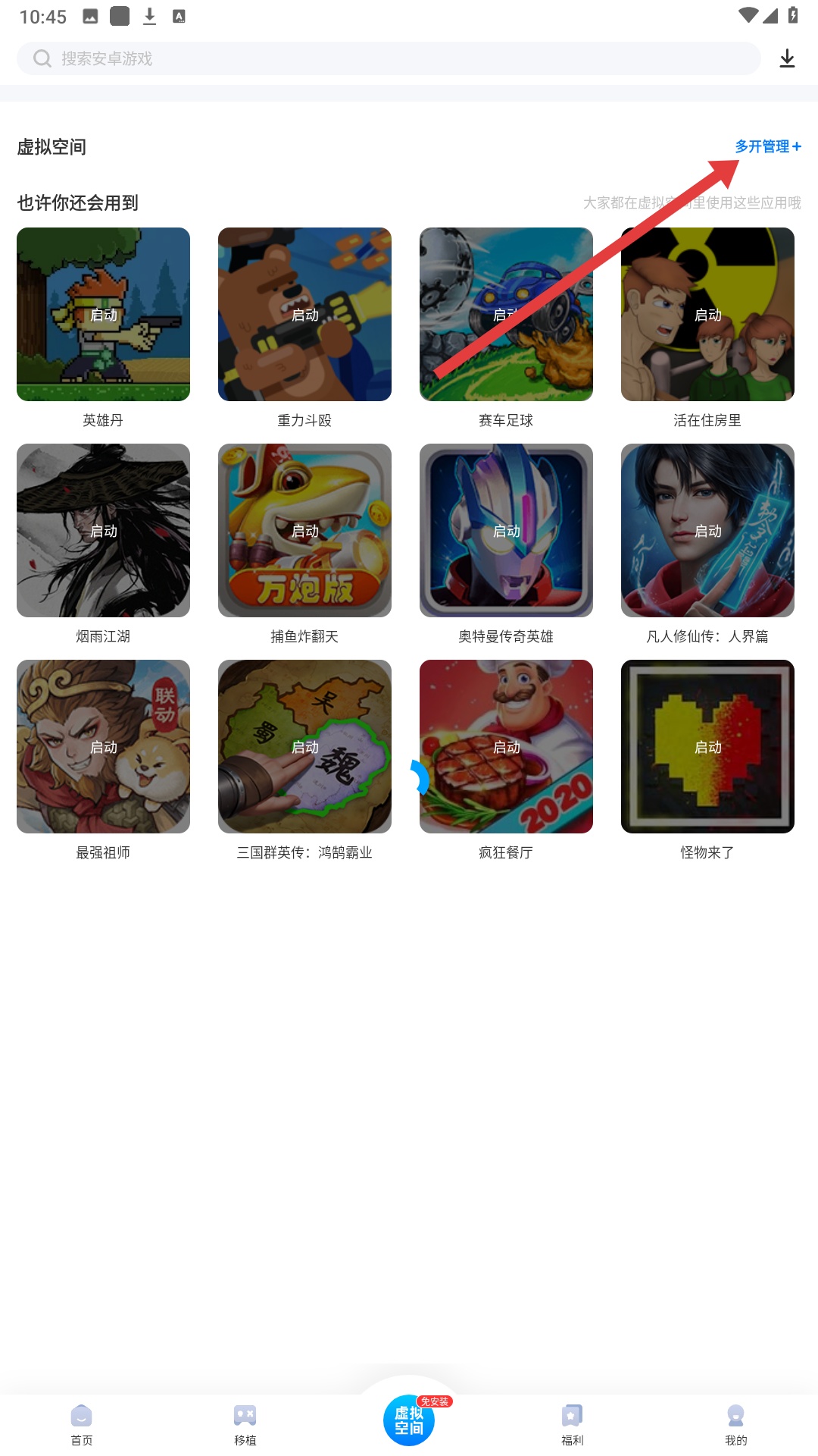 2、進入虛擬空間后,點擊多開管理加號,可進入多開管理界面,進行虛擬空間的創建操作。