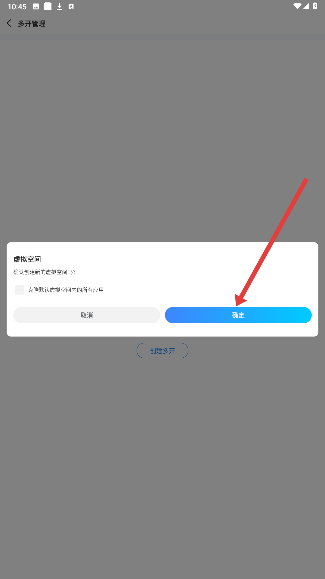3、多開管理界面,點擊創建多開,會彈出確認創建新虛擬空間的提示框,選擇是否克隆默認虛擬空間內的所有應用,點擊確定即可創建。