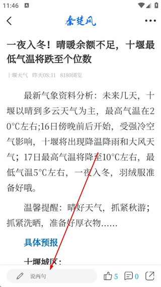4、進入資訊詳情頁后可查看具體內容,還能點擊說兩句,發表自己的看法,也可進行點贊分享。
