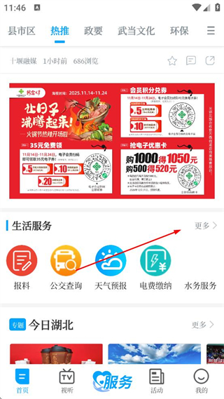 1、打開十堰廣電新聞軟件,進入服務板塊,找到生活服務區域,點擊更多可查看交通出行、醫療健康等各類服務分類,選擇所需服務類別。
