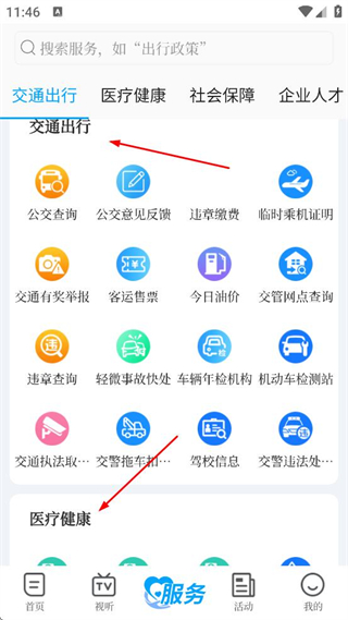 2、在服務分類進入交通出行板塊,可使用公交查詢、違章繳費等功能,也可切換到醫療健康板塊,使用相關醫療服務功能。