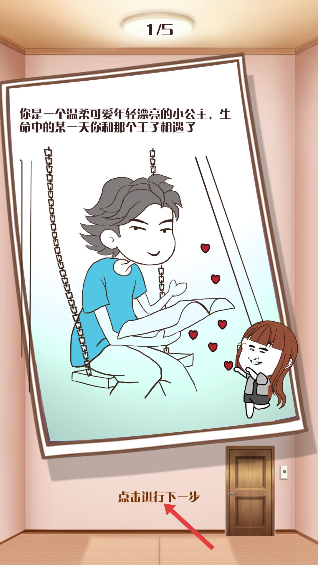 1、游戲開始有劇情展示,講述小公主與王子相遇,點擊進行下一步,可推進劇情,開啟后續的解謎或冒險環節。