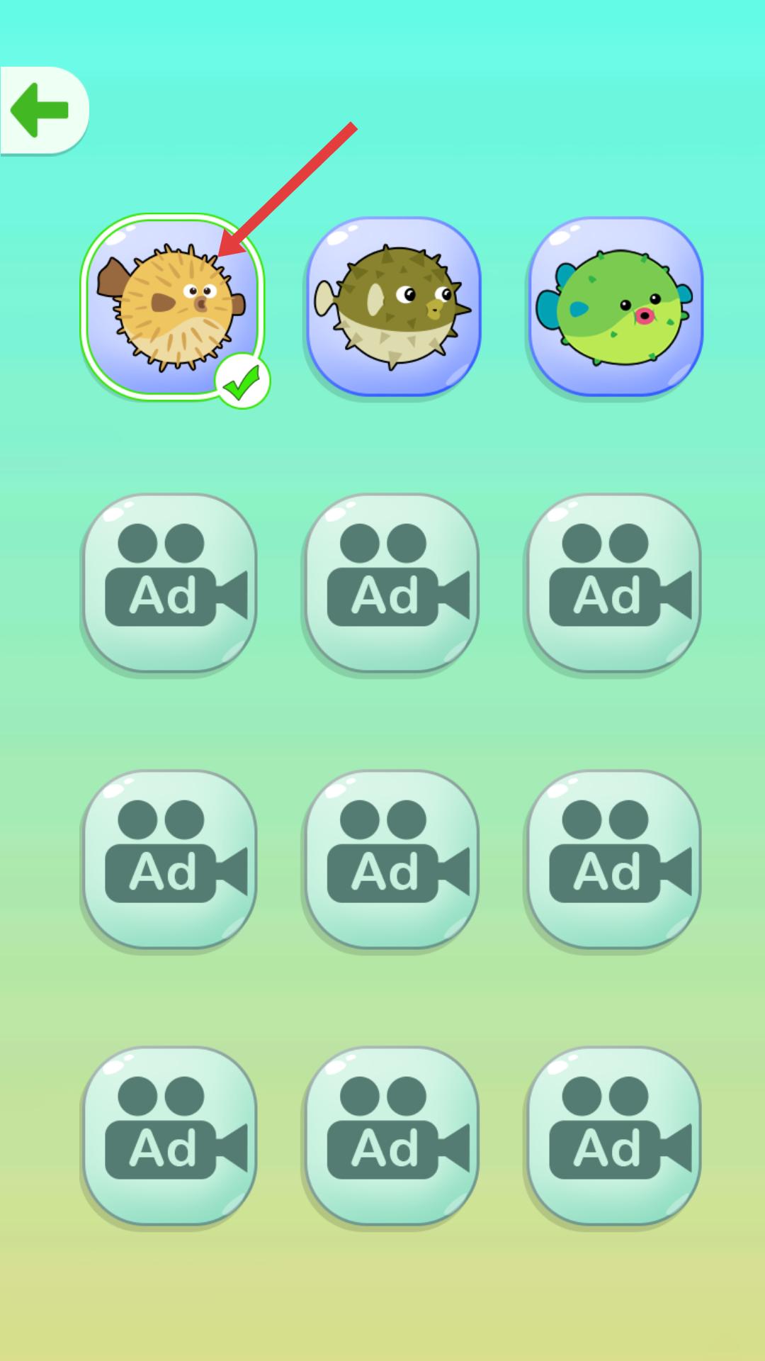 2、進入角色選擇界面,有不同河豚角色,選擇已解鎖的帶對勾標識的河豚角色,即可使用該角色進行游戲。