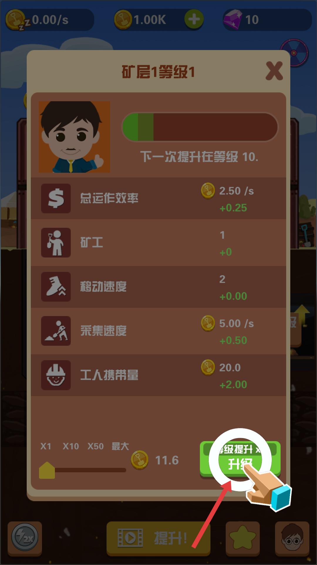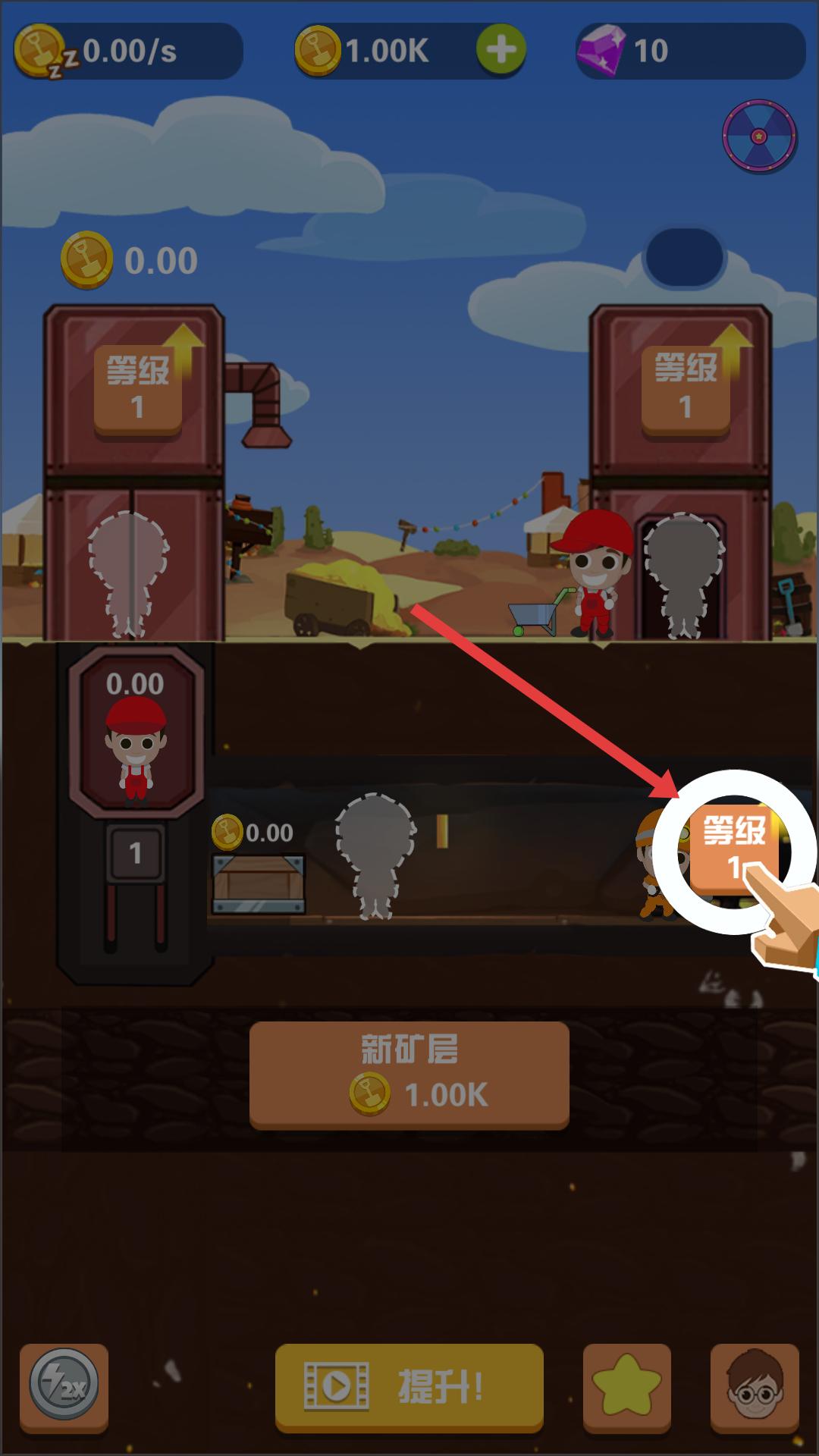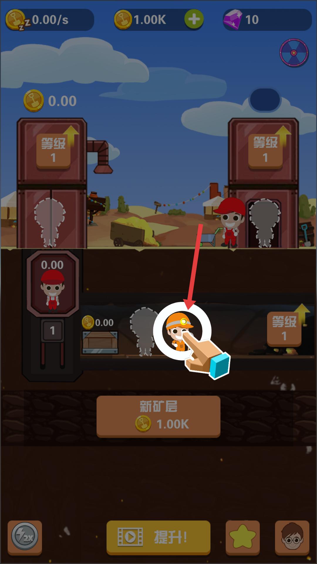 1、游戲界面中按照提示點擊礦工角色,可讓礦工開始在礦層中工作,進行礦石采集等操作,這是開啟采礦流程的第一步,推動游戲進程。