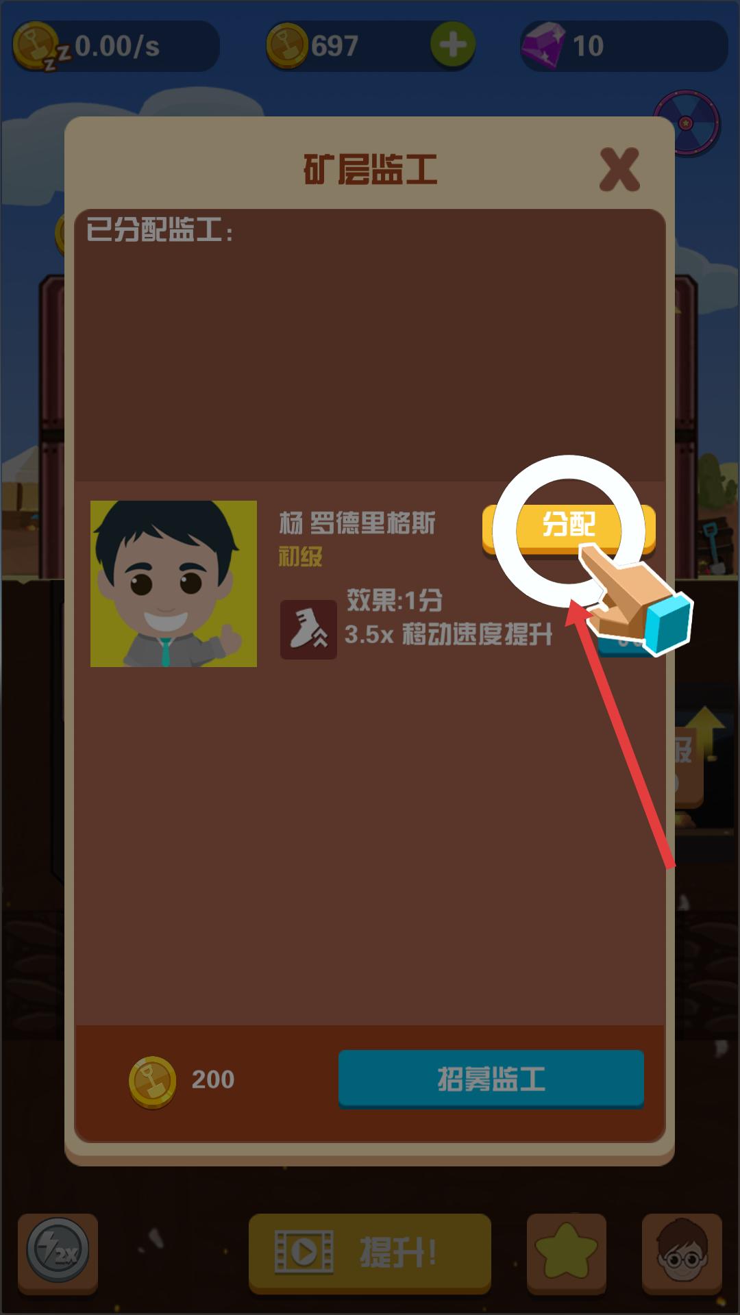 4、礦層升級可進入礦層監工界面,有監工楊羅德里格斯,點擊分配按鈕,將該監工分配到礦層,可借助監工效果,如提升移動速度,優化采礦工作。