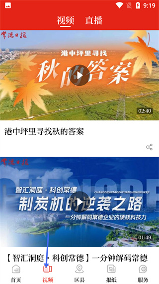 2、視頻板塊,含視頻、直播分類,有港中坪里尋找秋的答案、制炭機的逆襲之路等視頻,呈現本地視頻資訊。