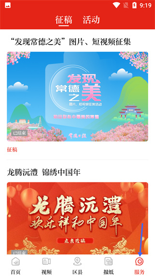 4、服務板塊,有征稿、活動分類,呈現發現常德之美、龍騰沅澧錦繡中國年等征稿活動,方便用戶參與互動。