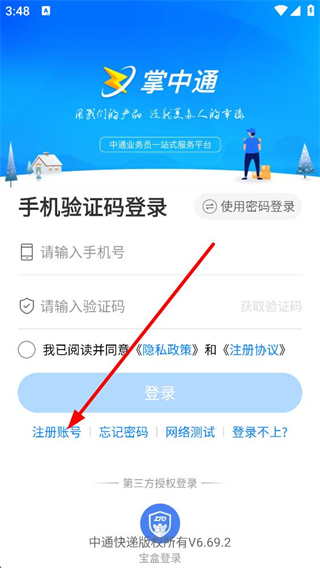 1、進入掌中通的登錄界面,默認顯示手機驗證碼登錄方式,需填寫手機號、驗證碼,勾選協議后可點擊登錄,也能切換密碼登錄,還提供注冊賬號等輔助選項。