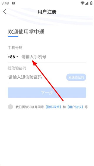 2、進入用戶注冊頁面,需選擇地區代碼并填寫手機號,點擊發送驗證碼后填入短信驗證碼,勾選協議后點擊下一步,即可推進注冊流程。