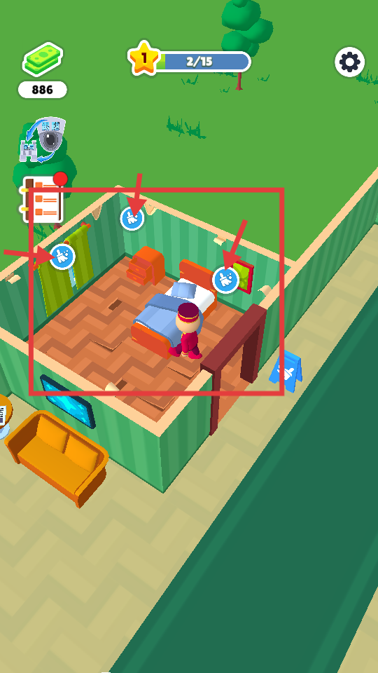 3、客人入住完進入客房后房間,其中有多個可互動的打掃圖標,點擊這些圖標可對客房設施進行操作,滿足客人需求提升客人滿意度。
