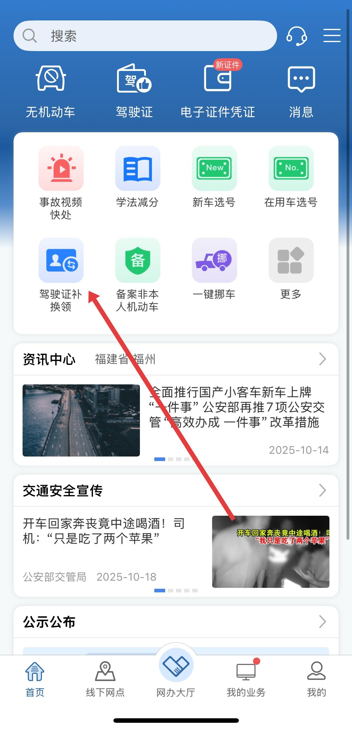 1、打開交管12123,在首頁找到駕駛證補換領選項,點擊進入駕駛證補換領界面。