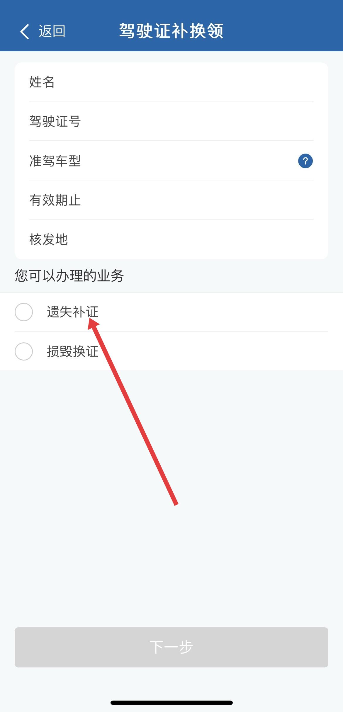 3、信息填寫頁面,選擇遺失補證業務類型,為后續補證操作做準備。
