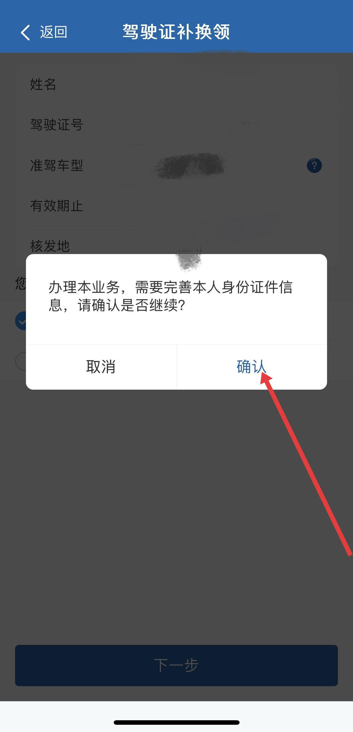 4、選擇后彈出提示框,提示辦理業務需完善身份證件信息,點擊確認,繼續補換領流程。