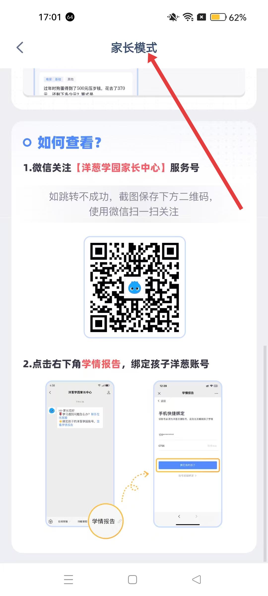 4、家長模式介紹頁面,按照提示關注相關服務號并綁定孩子賬號,完成家長模式的設置操作。