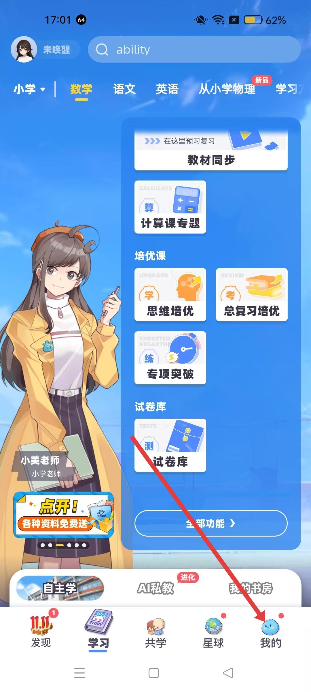 1、打開應用后,底部功能欄找到我的按鈕,點擊它進入個人界面,開啟家長模式設置流程。