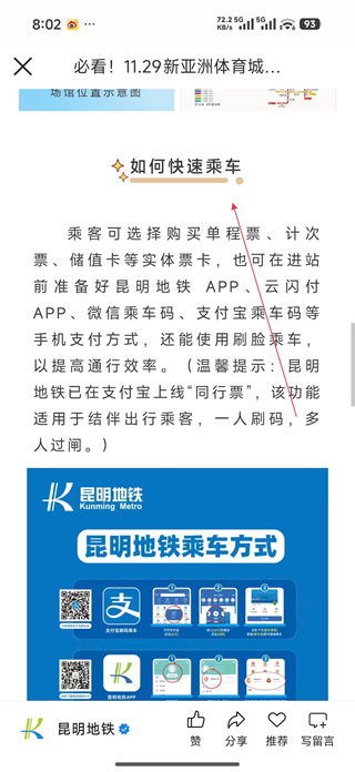 4、在資訊詳情頁面可查看快速乘車方式,選擇單程票計次票等實體票卡,或準備乘車碼刷臉乘車,也能使用同行票功能提升結伴出行效率。