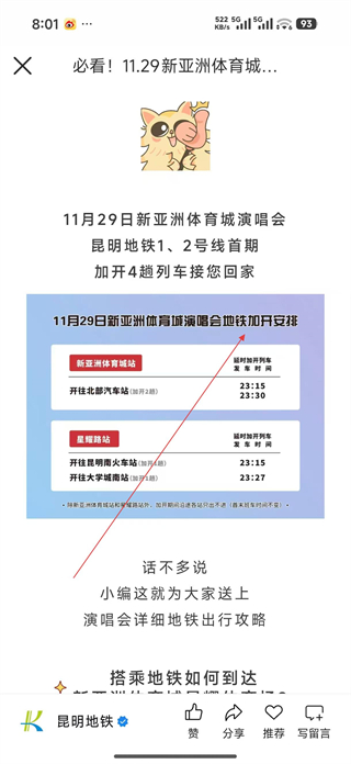 3、在資訊詳情頁面可查看地鐵加車安排等出行信息,了解演唱會等活動對應的地鐵運營調整,獲取詳細的地鐵出行攻略和站點相關安排。