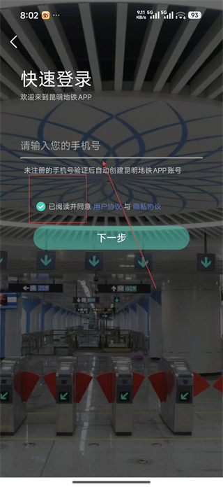 1、打開昆明地鐵APP,進入快速登錄頁面,輸入手機號,勾選已閱讀同意相關協議,點擊下一步按鈕,未注冊的手機號驗證后會自動創建賬號完成登錄。