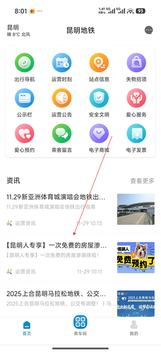 2、登錄后進入首可查看出行導航運營時刻等功能入口,瀏覽資訊板塊的內容,選擇感興趣的資訊,點擊即可進入詳情頁面查看具體信息。