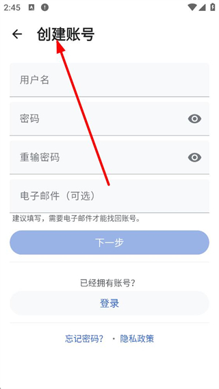3、創建賬號需填寫用戶名、密碼并重復驗證,還可填寫電子郵箱用于賬號找回,完成后點擊下一步繼續流程。