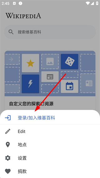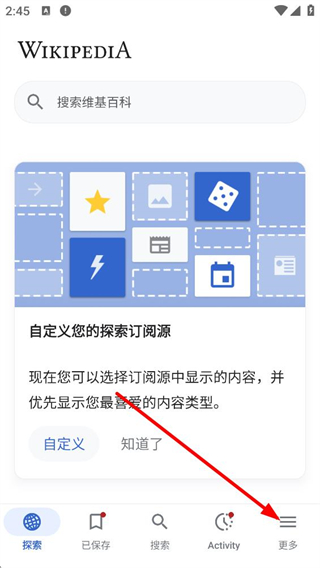 1、進入探索頁面可搜索維基百科內容,還能自定義訂閱源優先顯示喜愛的內容類型,點擊更多可展開功能菜單。