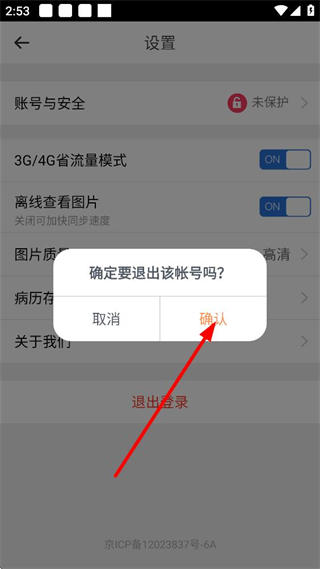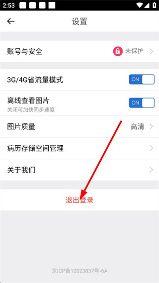 3、設置界面,可管理賬號與安全、離線查看圖片、圖片質量、病歷存儲空間等,還可查看關于我們信息,底部有退出登錄選項,點擊可退出當前賬號。