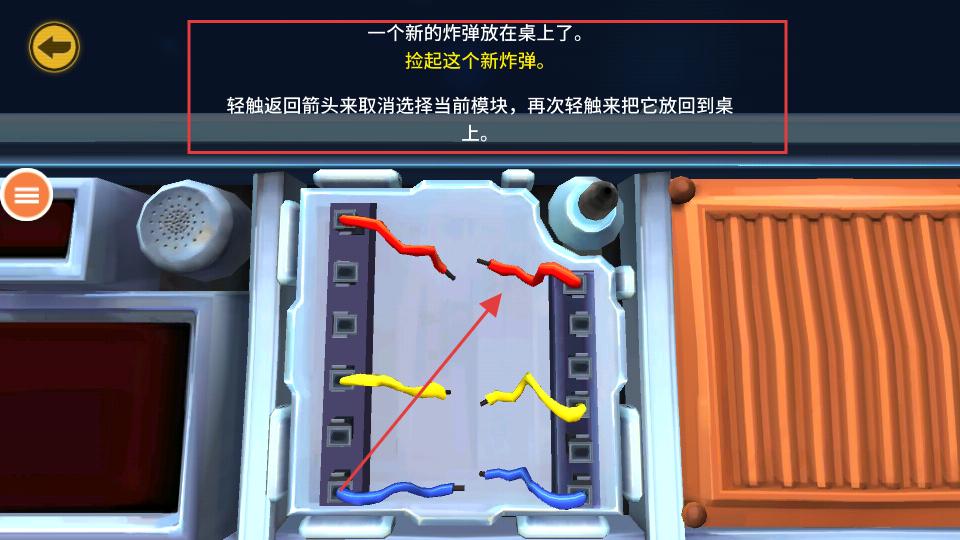 4、當桌上出現新的炸彈時,輕觸返回箭頭取消選擇當前模塊,之后再次輕觸,把新炸彈放回桌上,完成新炸彈的拿取與放置操作。