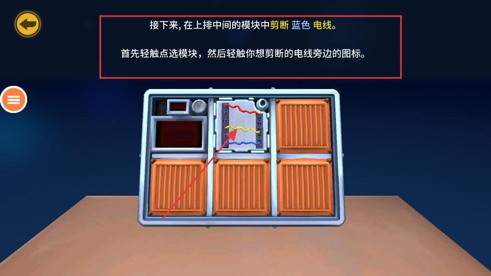 3、接著在上排中間的模塊中先輕觸點選該模塊,然后輕觸藍色電線旁邊的圖標,按照提示剪斷藍色電線,推進拆彈進程。