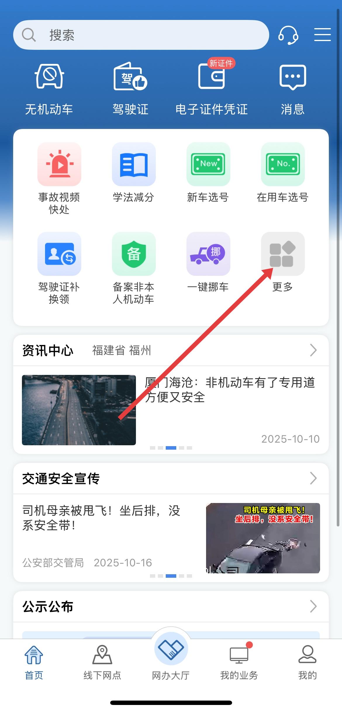 1、打開交管12123,在首頁點擊更多,進入業務中心,查找機動車轉籍相關業務。
