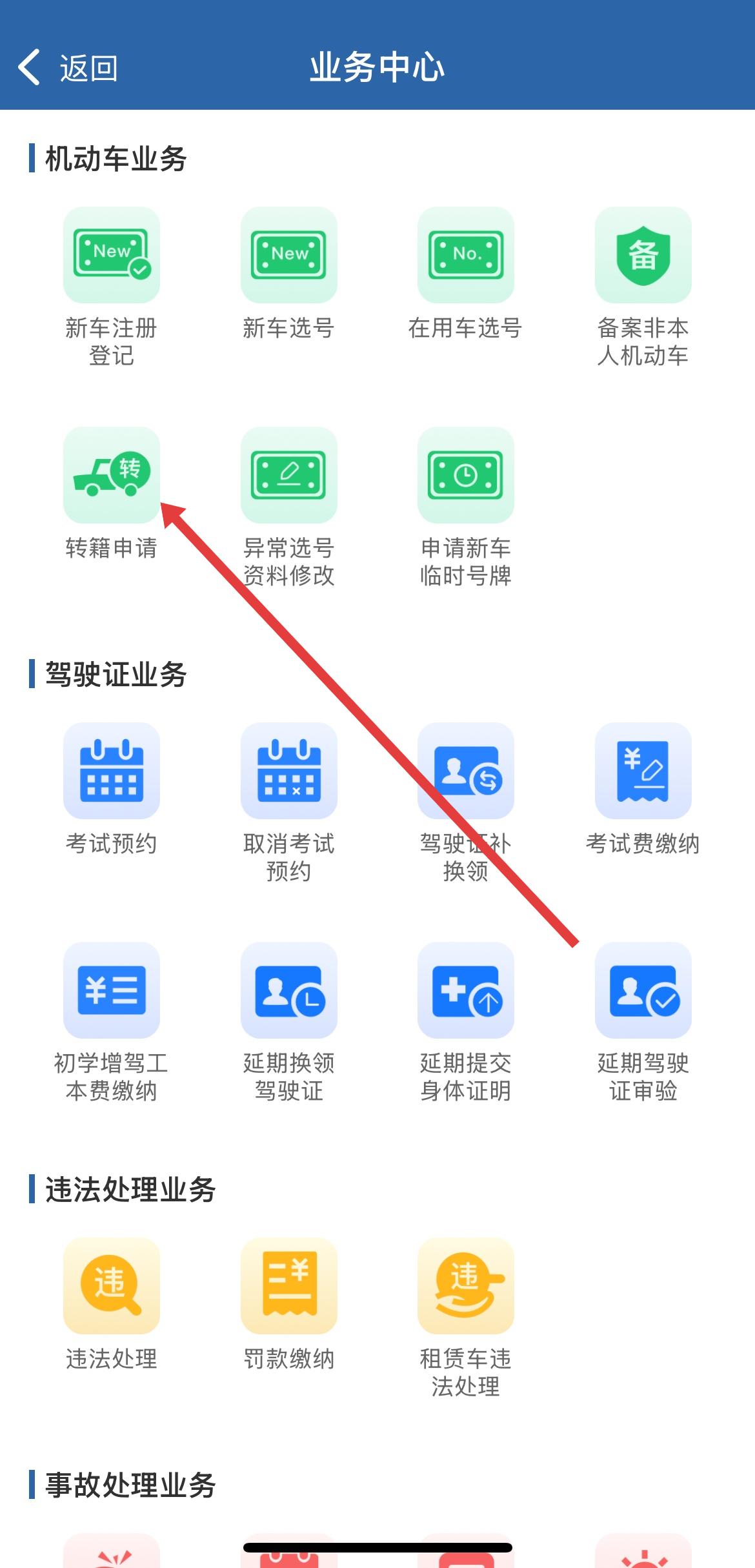 2、業務中心的機動車業務里,點擊轉籍申請,進入轉籍申請操作頁面。