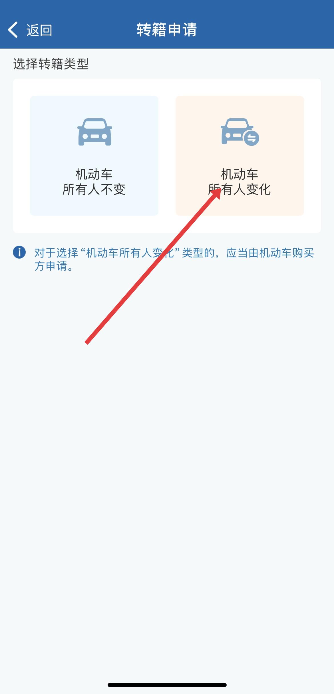 3、轉籍申請頁面,選擇機動車所有人變化的轉籍類型,明確轉籍情況。