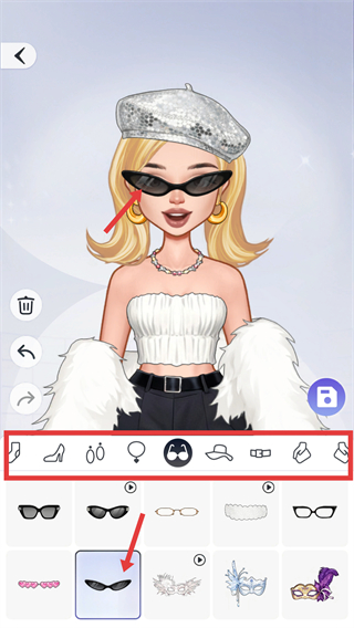 3、進入裝扮界面從下方眾多配飾中選擇,比如墨鏡點擊想要的墨鏡款式,為角色進行佩戴打造個性造型。