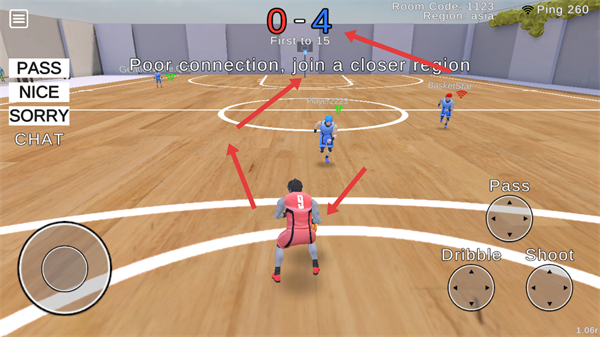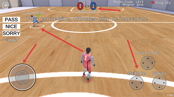 3、在比賽的過程,左側搖桿控制角色移動,右側有運球、投籃等按鈕,還有傳球等功能,操控角色參與籃球攻防。