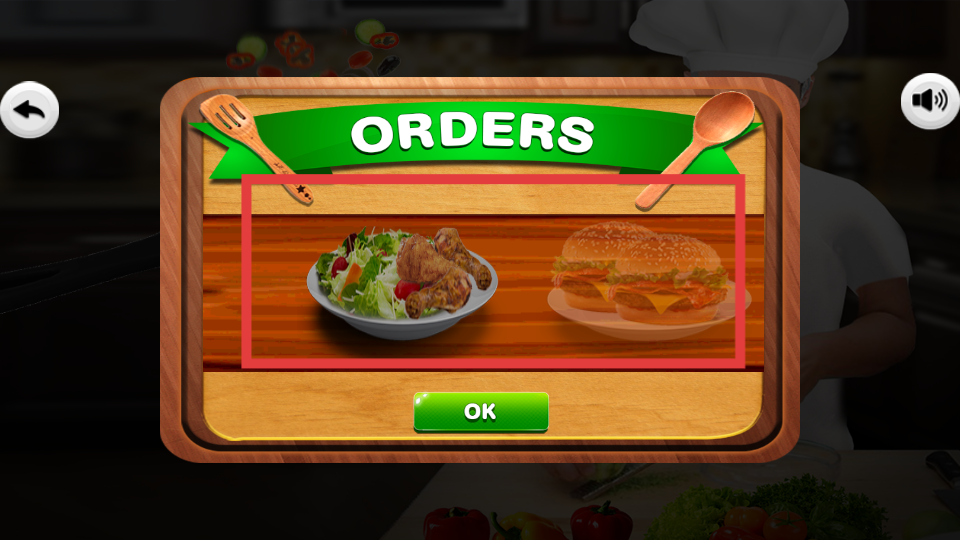 2、接著會出現訂單界面,展示有沙拉配炸雞、漢堡等菜品,確認訂單內容后點擊OK按鈕,開始準備對應餐品。