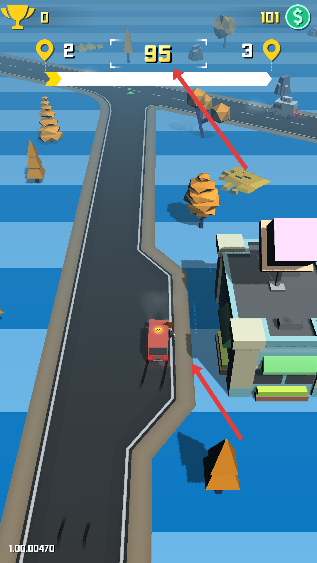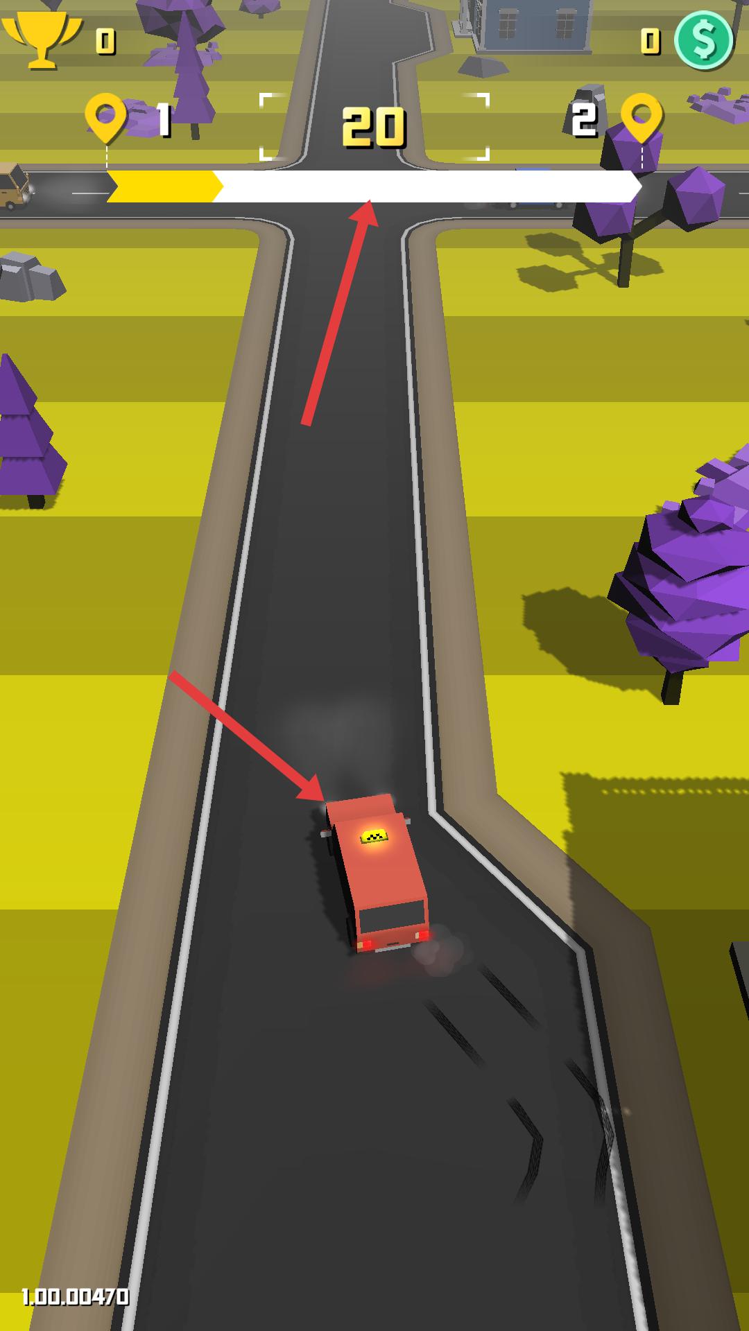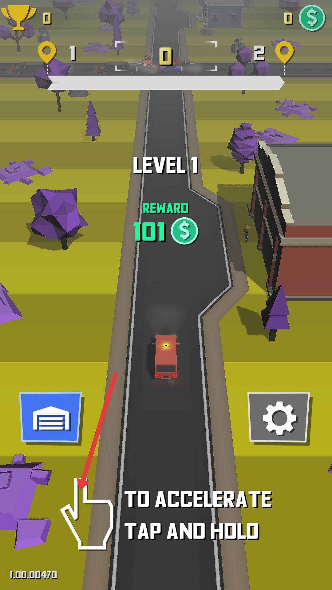 1、游戲第一關按照提示,點擊并按住屏幕,可讓車輛加速前進,開始在道路上行駛,朝著目標位置移動。