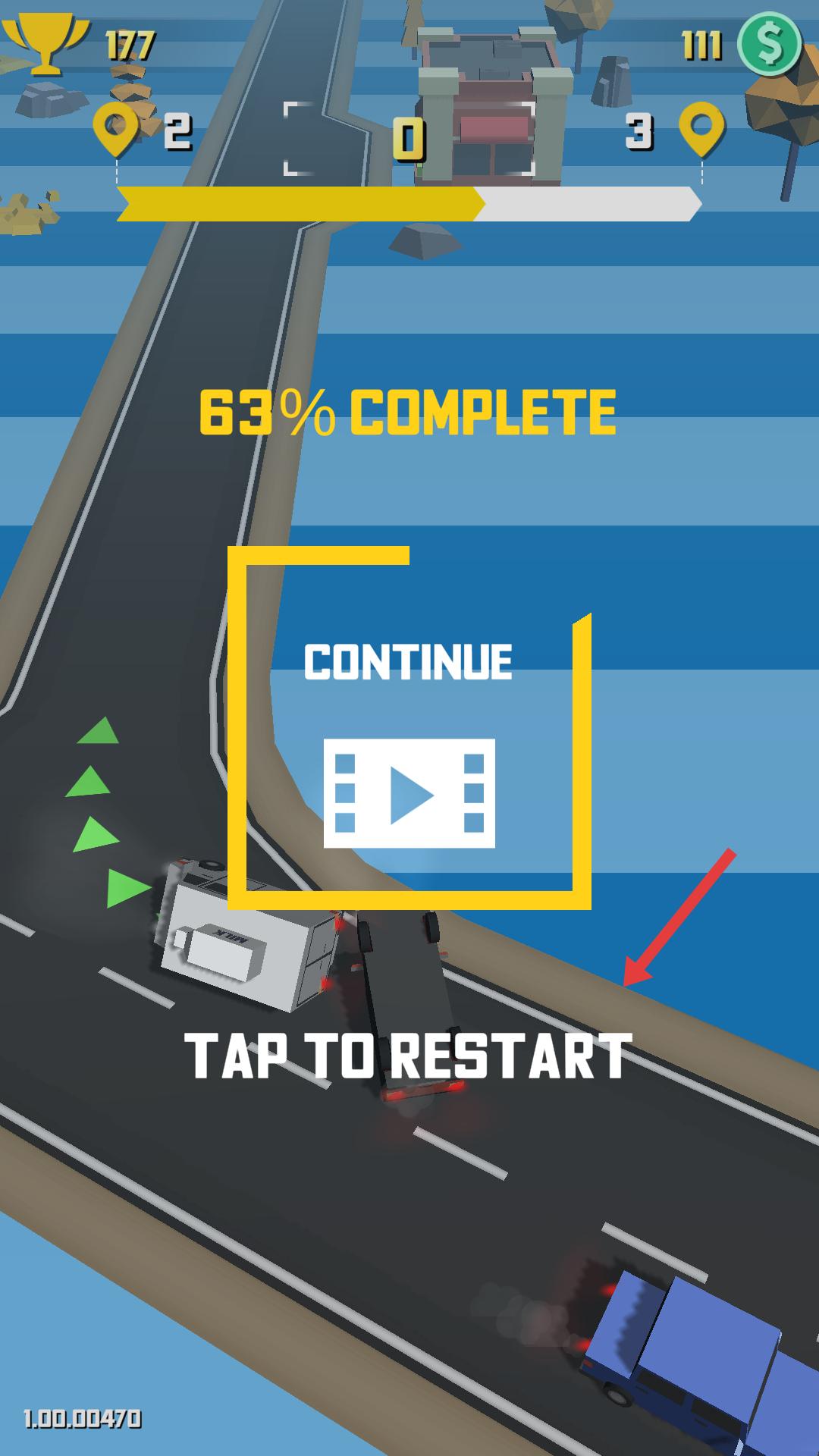 4、若車輛發生碰撞等情況導致游戲暫停,界面顯示重新開始,點擊屏幕可重新開始當前關卡,繼續挑戰。