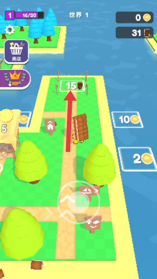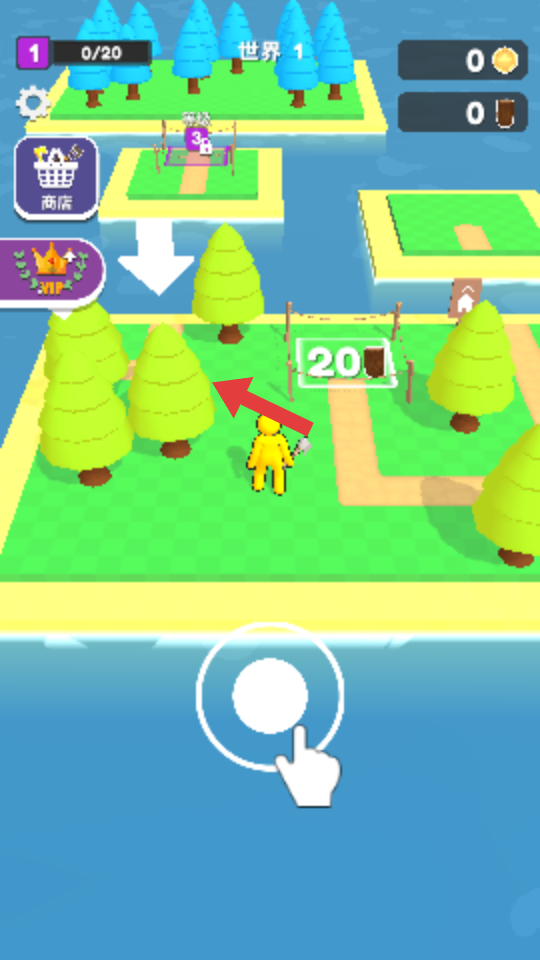 1、進入游戲,操控小人在有樹木的小島上移動,朝著標有木材數量的區域前進,開始伐木收集木材,為后續操作做準備。